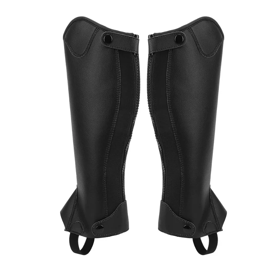 These premium leather half chaps are crafted from 100% genuine leather, offering riders maximum comfort, protection, and durability. Designed for both men and women, they feature a sleek black finish with reinforced stitching, elastic panels for flexibility, and secure snap-button closures for a perfect fit.
